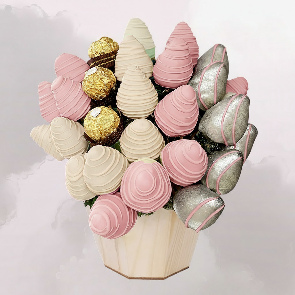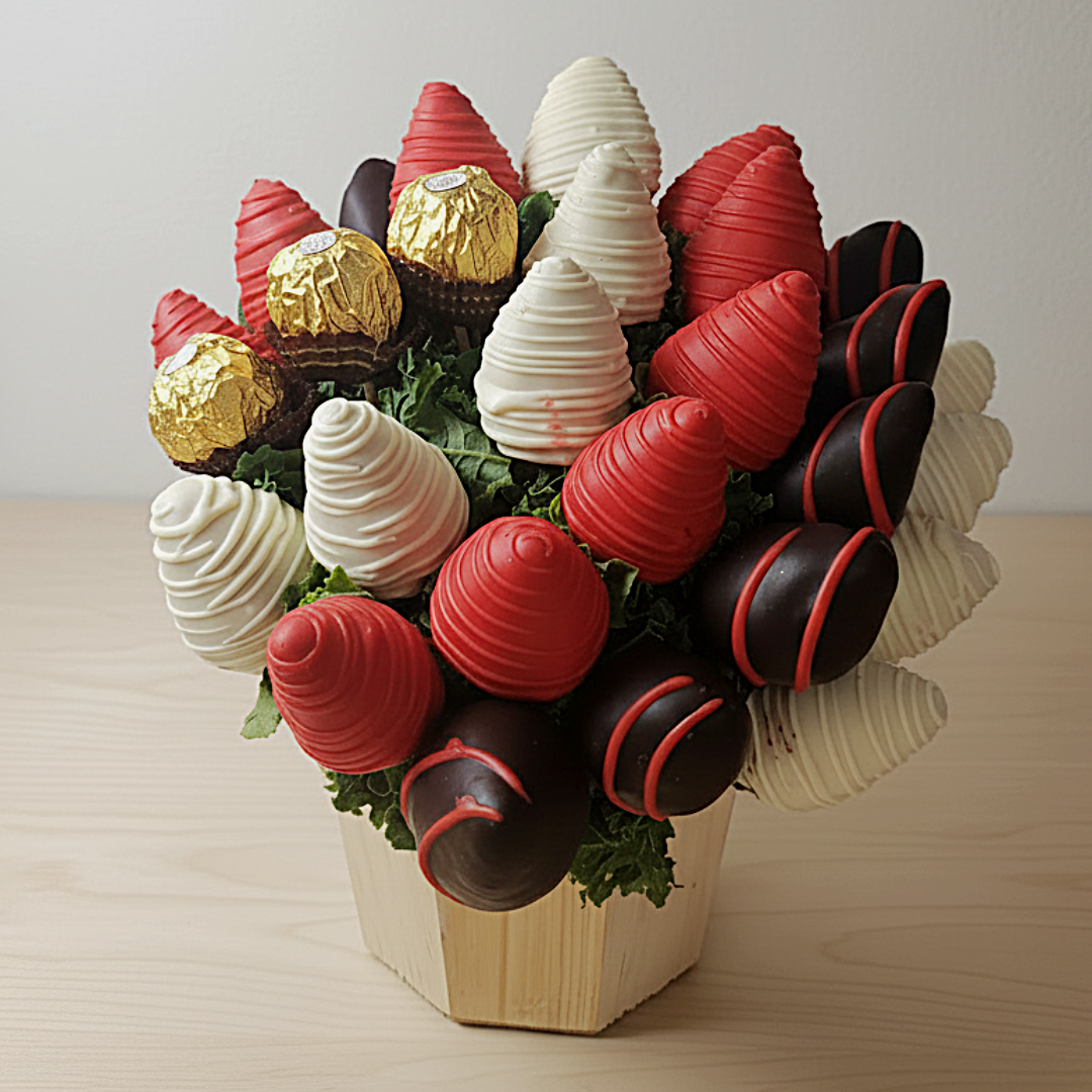 Ramo de fresas con chocolate decoradas y chocolates Ferrerro