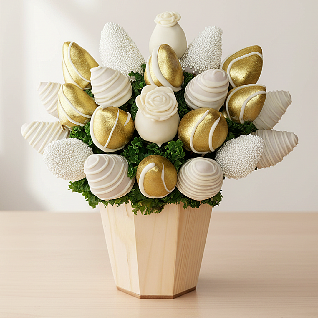 - Toppings: Grageas blancas, rosas blancas de chocolate